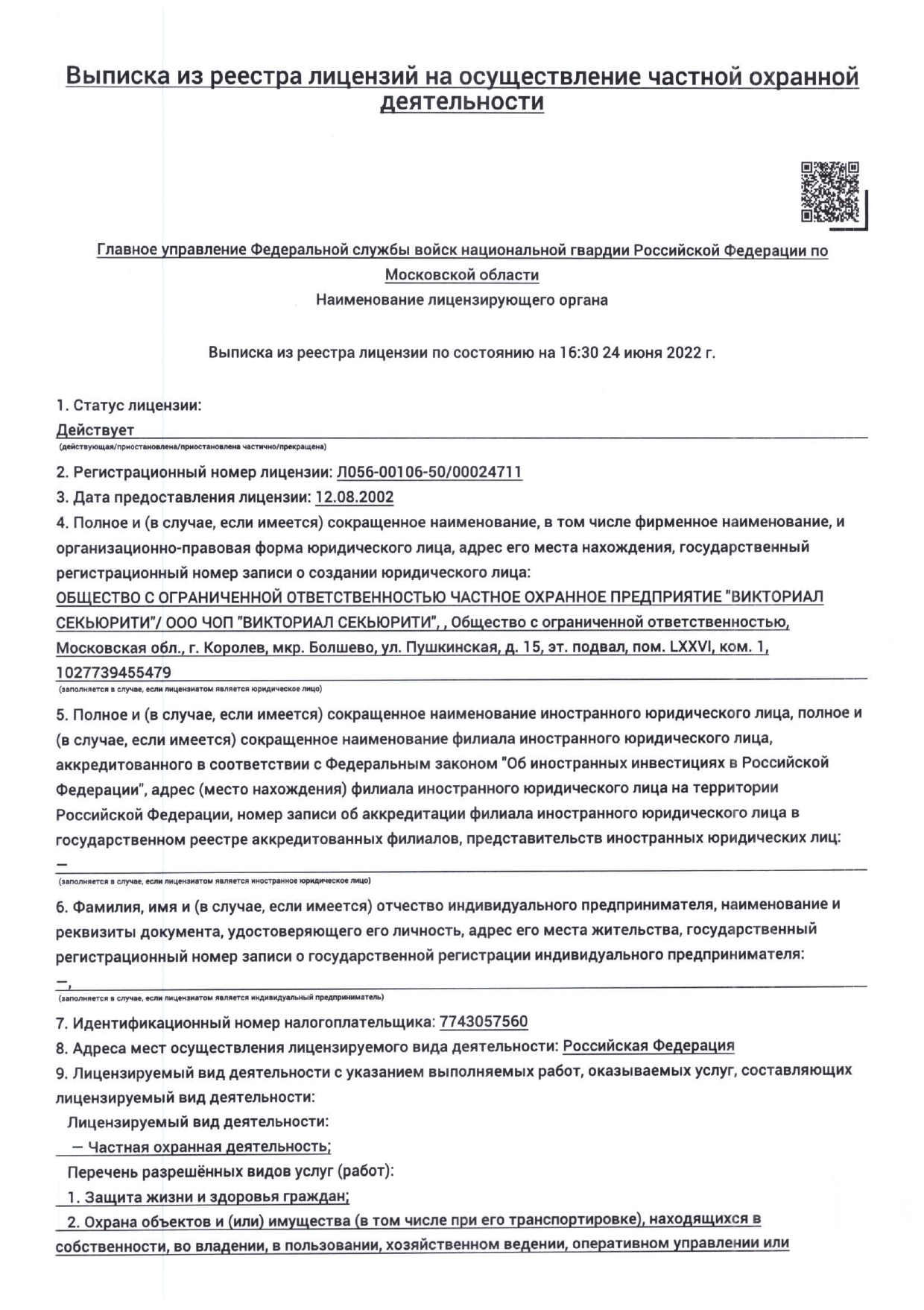 Общество с ограниченной ответственностью Частное охранное предприятие «ВИКТОРИАЛ СЕКЬЮРИТИ» основано в 2002 году и осуществляет свою деятельность на основании лицензии № 3175 выданной Главным управлением Росгвардии по Московской области. За истекший период наше предприятие зарекомендовало себя на рынке охранных услуг стабильной организацией с высоким качеством оказываемых услуг, индивидуальным подходом к решению задач, поставленных нашими заказчиками, компетентными и дисциплинированными сотрудниками охраны, регулярно проходящими различные тренинги и повышения квалификации.